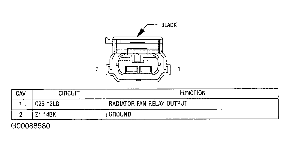 2. Turn ignition off. Disconnect radiator fan motor harness connector. Measure resistance between ground and ground circuit (Black wire) at radiator fan motor harness connector. See Fig 1 . If resistance is less than 5 ohms, go to next step. If resistance is 5 ohms or more, repair open in ground circuit.