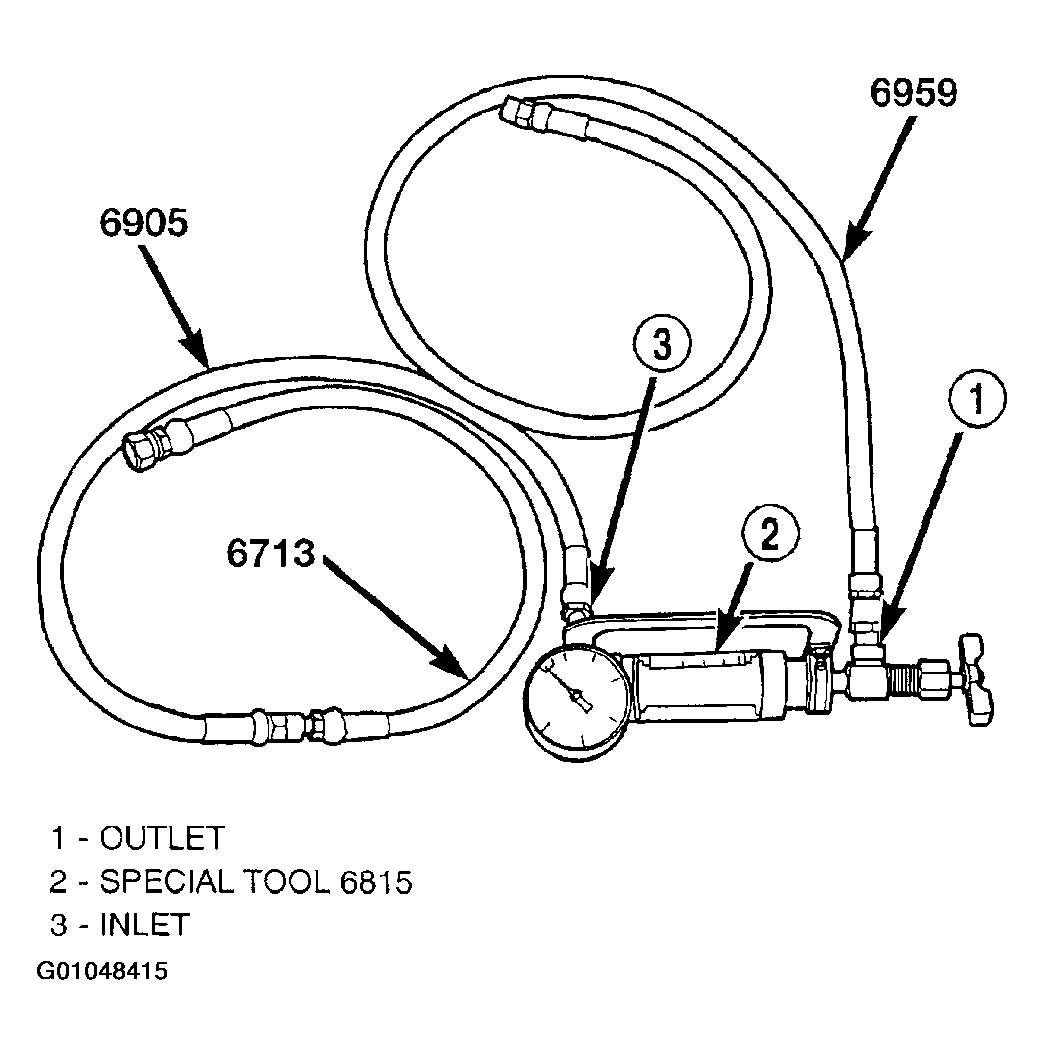 1. Assemble hoses on Power Steering Analyzer, Special Tool 6815, as shown. Install Pressure Hose, Special Tool 6905 (in 6893 kit), in the inlet fitting on Power Steering Analyzer. Install Pressure Hose, Special Tool 6713 (in 6815 kit) on Pressure Hose, Special Tool 6905. Install Pressure Hose, Special Tool 6959, in the outlet fitting on Power Steering Analyzer.