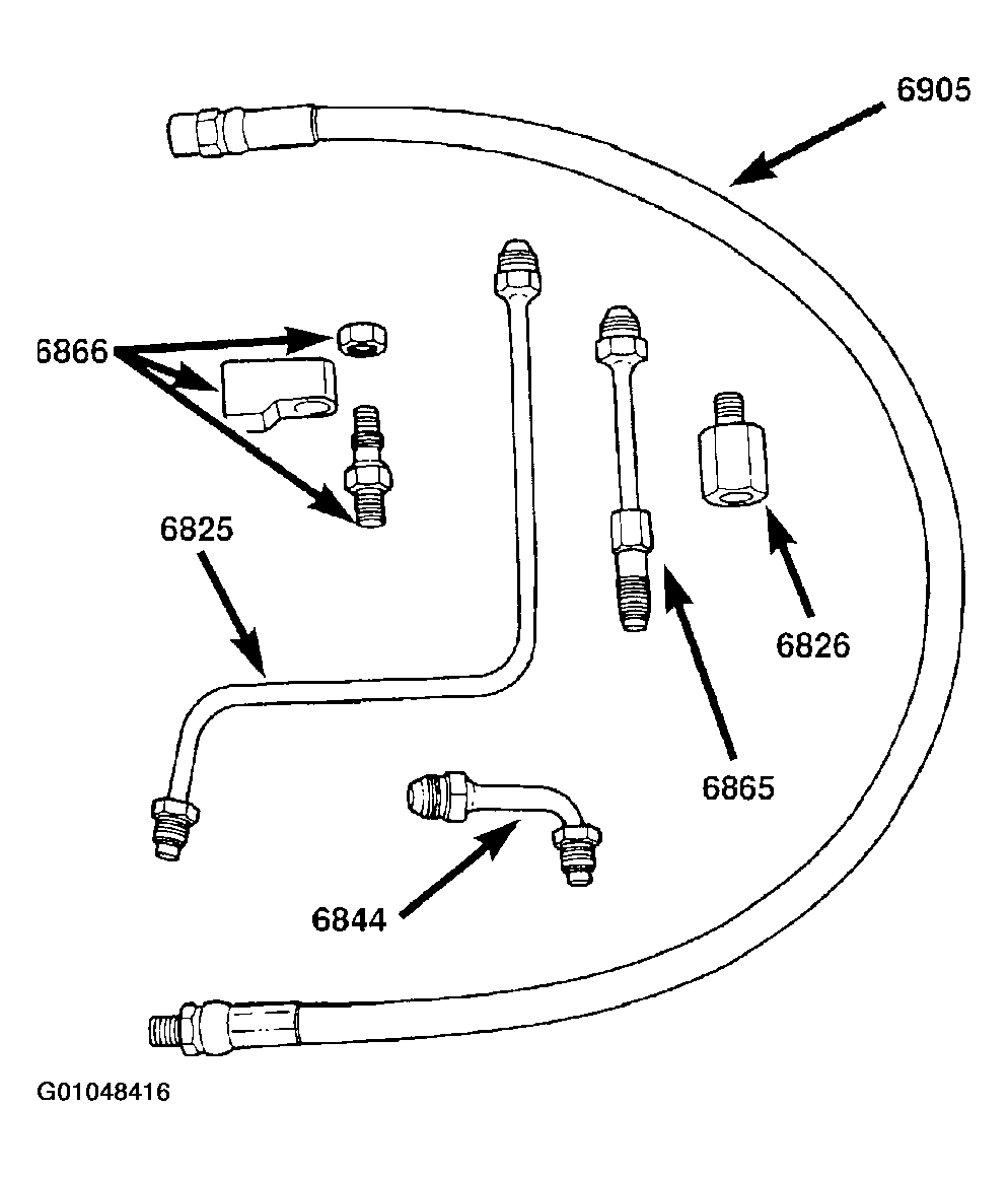 2. Install Adapter Fitting, Special Tool 6844, on Pressure Hose, Special Tool 6713. Install Adapter Fitting, Special Tool 6826, on Pressure Hose, Special Tool 6959. Both Special Tool 6844 and 6826 can be found in Adapter Set, Special Tool 6893. (Fig 2).