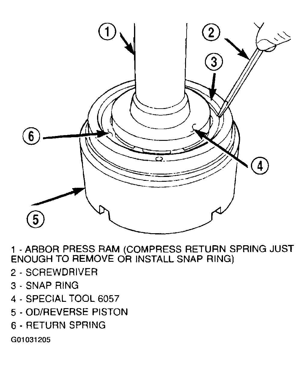 - Using an arbor press and Tool 6057, install OD/Reverse piston return spring and snap ring. (Fig 3 and Fig 4 ).