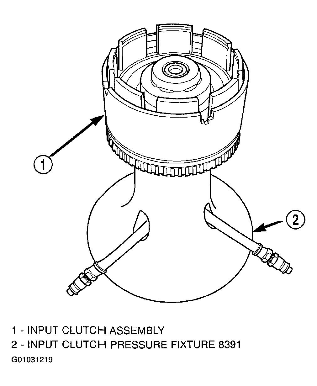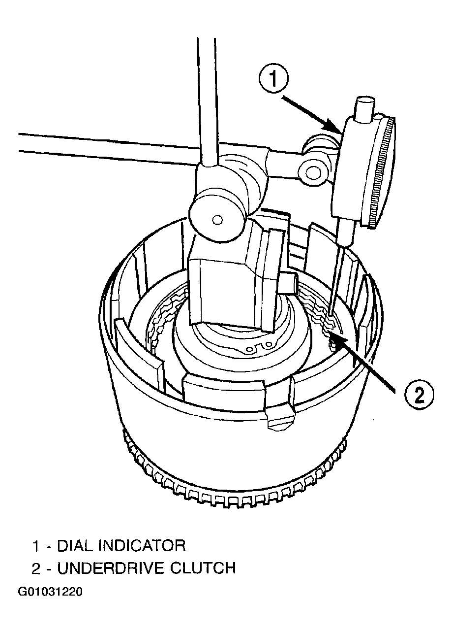 - Zero dial indicator and apply 30 psi (206 kPa) air pressure to the overdrive clutch hose on Tool 8391. Measure and record OD clutch pack measurement in four (4) places, 90° apart.