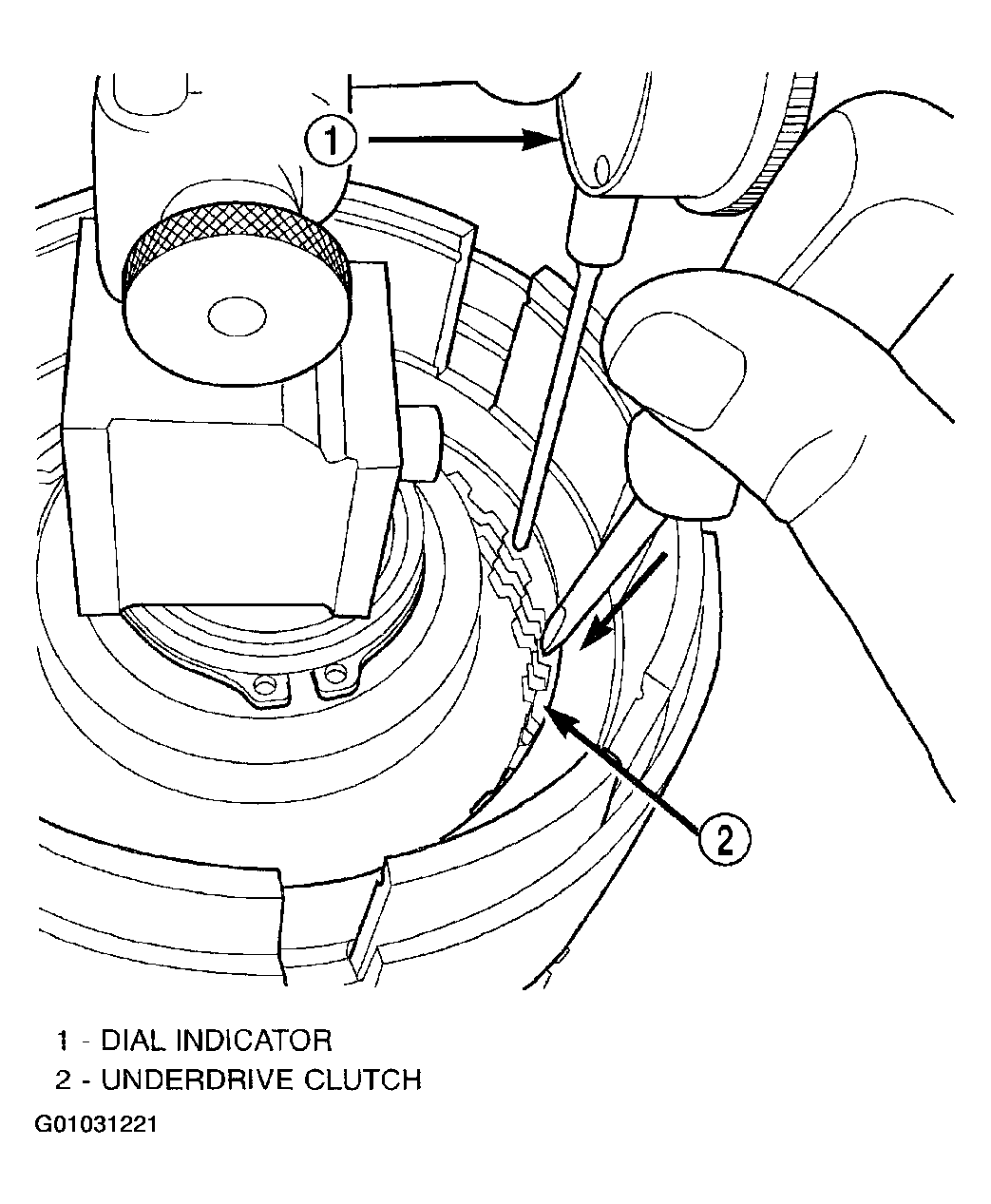 - Set up a dial indicator on the reverse clutch pack as shown in (Fig 31).