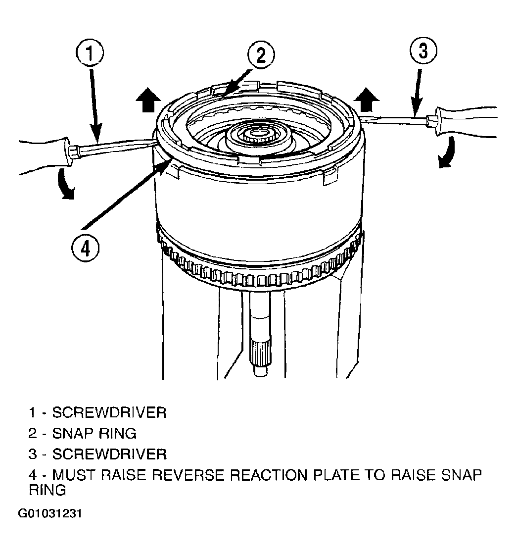- Tap reaction plate down to allow installation of the reverse clutch snap ring. Install reverse clutch snap ring. (Fig 29).