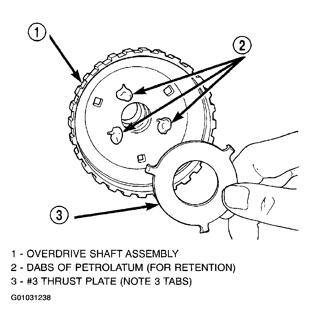 - Install the #3 thrust plate to the bottom of the overdrive shaft assembly. Retain with petrolatum or transmission assembly gel. (Fig 37).