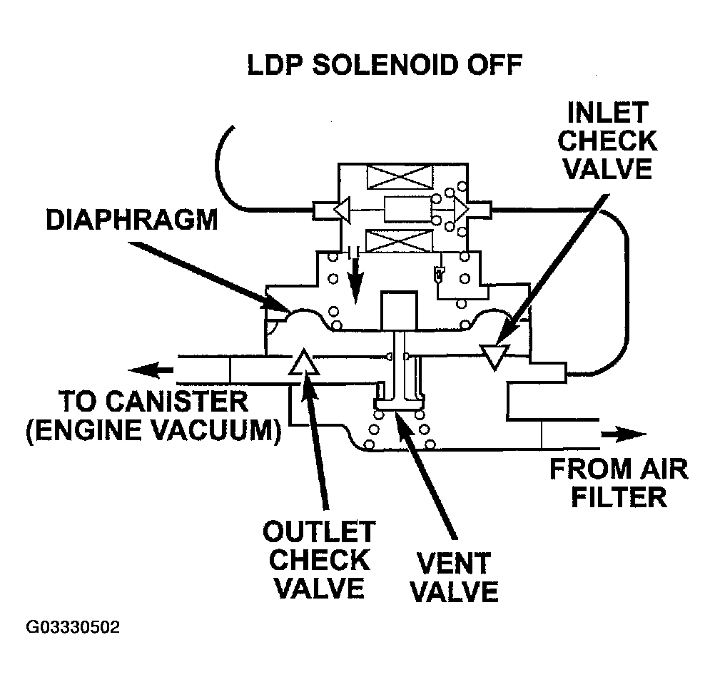 Based on reed switch input, the PCM de-energizes the LDP solenoid, causing it to block the vacuum port, and open the atmospheric port. This connects the upper pump cavity to atmosphere through the EVAP air filter. The spring is now able to push the diaphragm down. The downward movement of the diaphragm closes the inlet check valve and opens the outlet check valve pumping air into the evaporative system. The LDP reed switch turns from open to closed, allowing the PCM to monitor LDP pumping (diaphragm up/down) activity (Fig 1). During the pumping mode, the diaphragm will not move down far enough to open the vent valve.