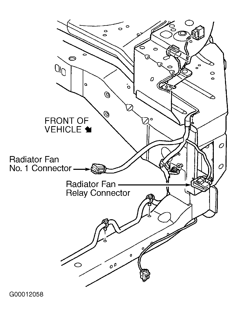 1. Turn ignition off. Disconnect radiator fan relay connector. Radiator fan relay is located near driver's side frame rail. See Fig 1 . Connect a jumper wire between Orange/Red and Dark Blue/Dark Green wires at radiator fan relay harness connector. If one or both radiator fans is not operating, go to next step. If both radiator fans operate, no problem is indicated at this time. Test is complete.