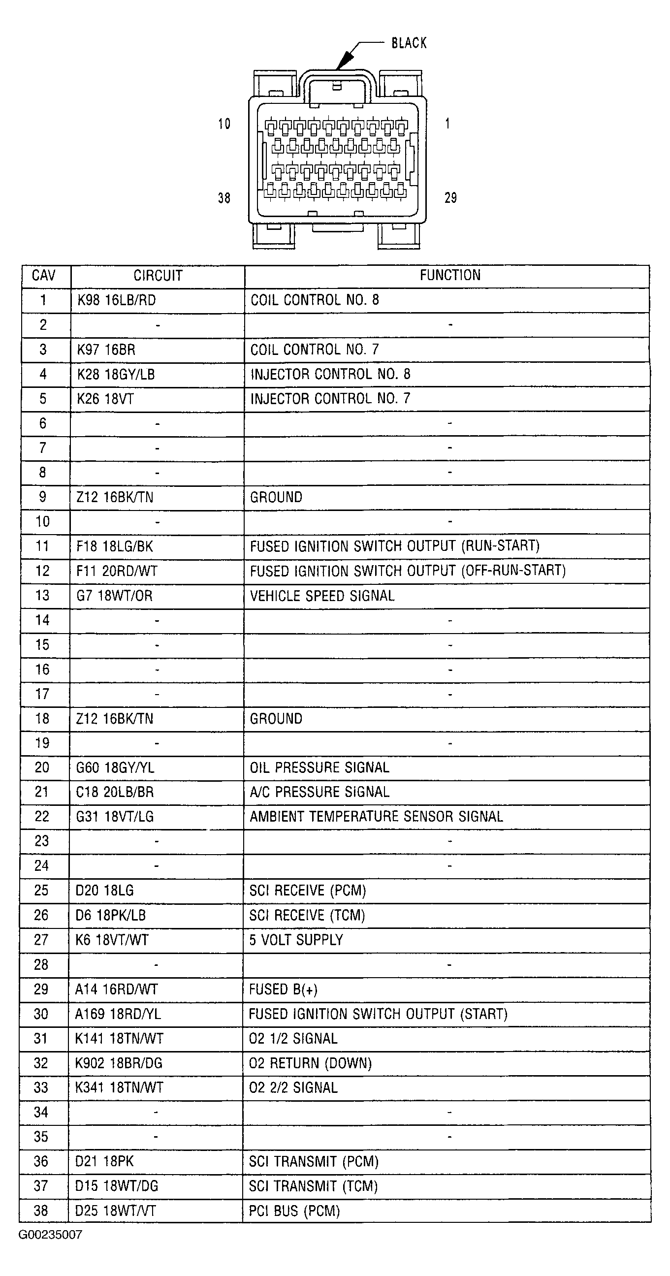- Turn the ignition off. Disconnect the PCM harness connectors. See Fig 6 . Using a 12-volt test light connected to ground, probe the PCM C1 fused B+ circuit in the appropriate terminal of the Miller Special Tool (8815). See Fig 7 . Does the test light illuminate brightly? If yes, go to next step. If no, repair the PCM fused B+ circuit for an open. Check related fuses and repair as necessary.