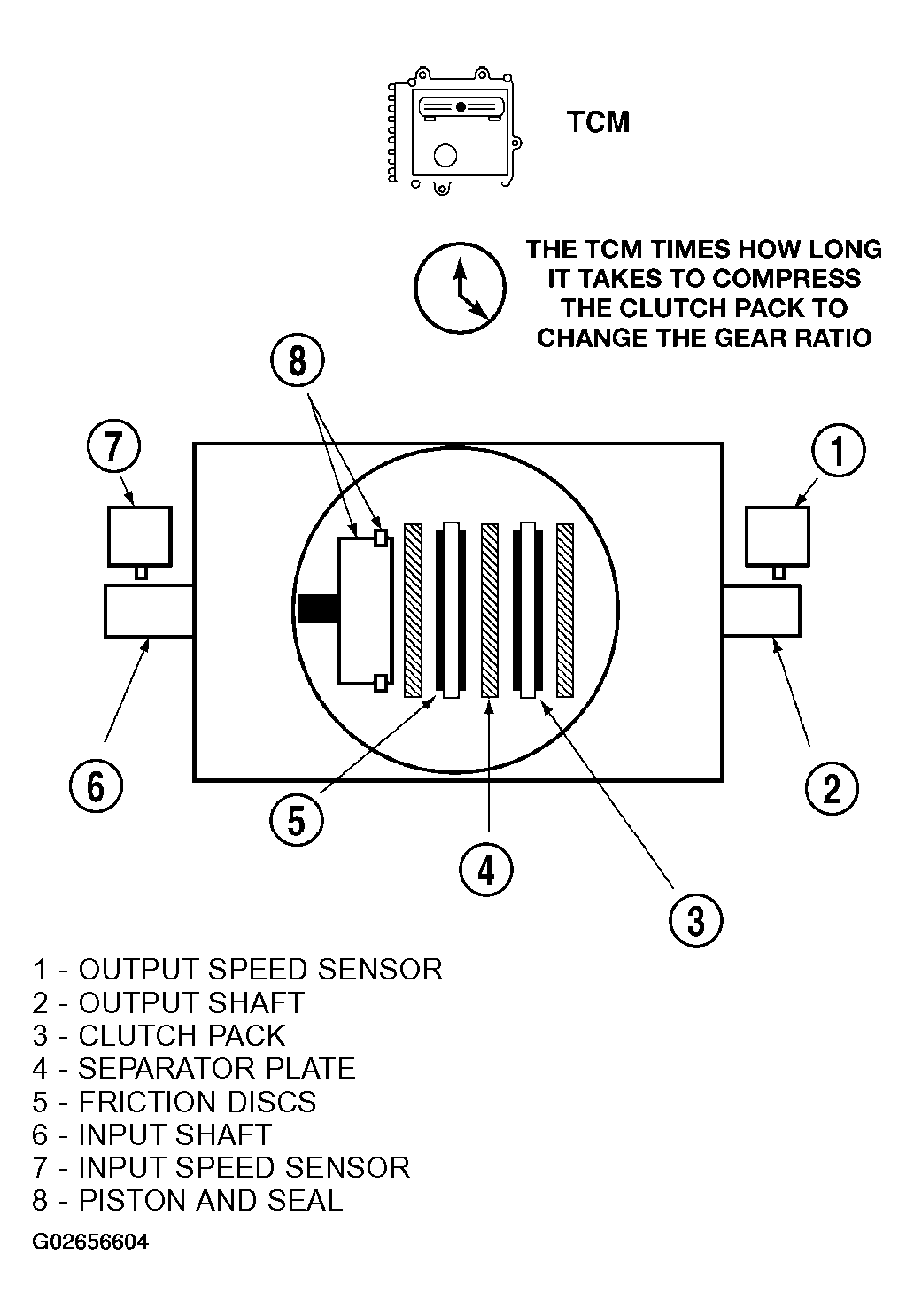 The TCM monitors gear ratio changes by monitoring the Input and Output Speed Sensors. The Input, or Turbine Speed Sensor sends an electrical signal to the TCM that represents input shaft rpm. The Output Speed Sensor provides the TCM with output shaft speed information.