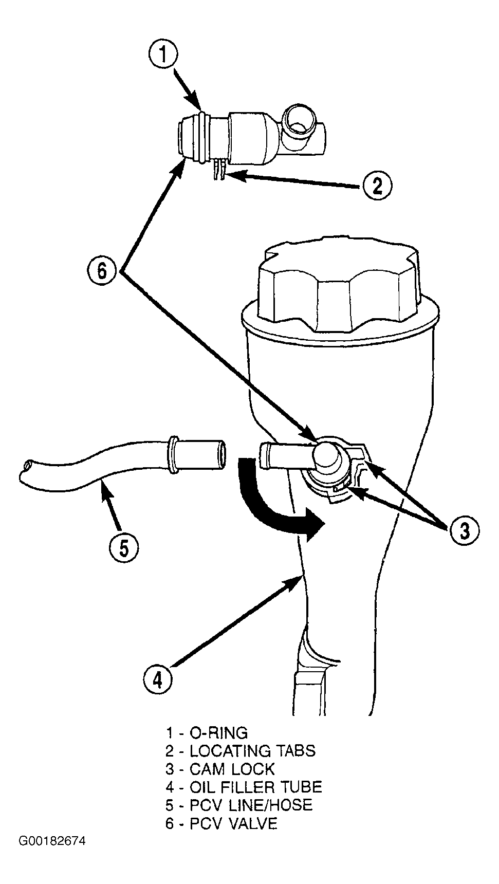 - Remove PCV valve at oil filler tube by rotating PCV valve downward until locating tabs have been freed at cam lock. After tabs have cleared, pull valve straight out from filler tube. To prevent damage to PCV valve locating tabs, valve must be pointed downward for removal. Do not force valve from oil filler tube. See Fig 1