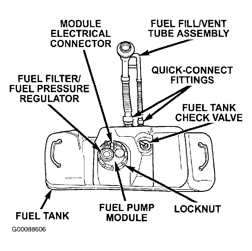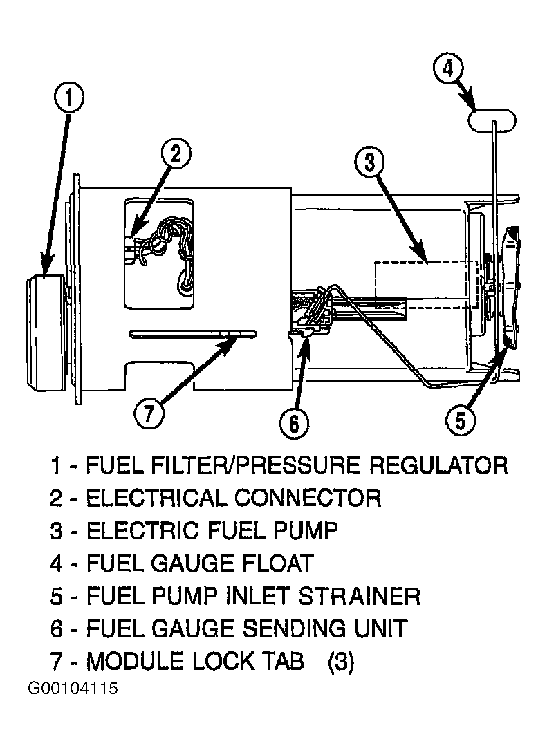 - Release fuel pressure. See FUEL SYSTEM PRESSURE RELEASE . Remove the fuel pump module from the fuel tank and inspect the fuel pump inlet strainer. See Fig 1 and Fig 2 . If the fuel pump inlet strainer is plugged, replace the fuel pump inlet strainer. If the fuel pump inlet strainer is not plugged, replace fuel pump module.