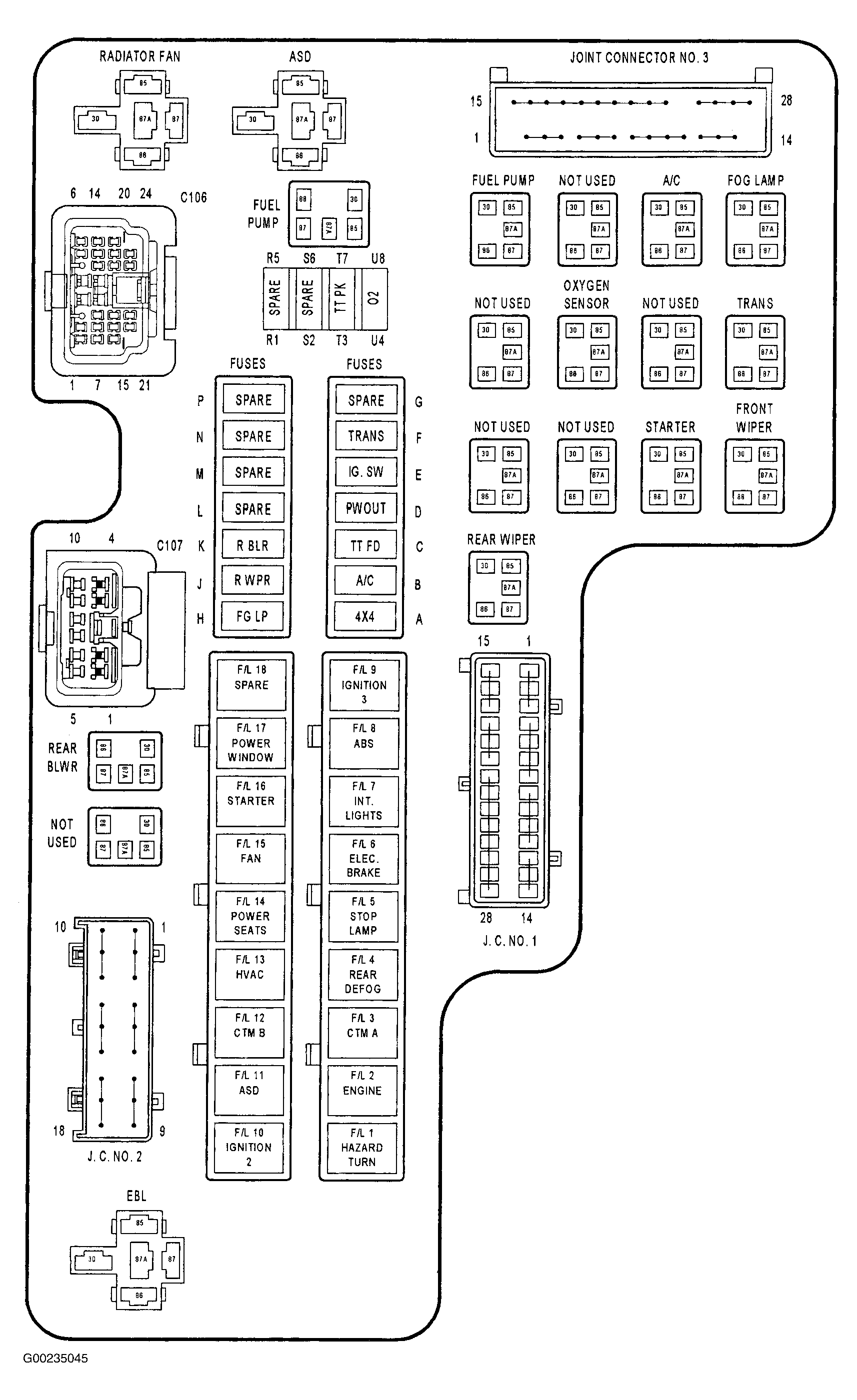 - Turn the ignition off. Remove the fuel pump relay from the PDC. See Figure . Using 12-volt test light connected to ground, backprobe the fuel pump relay fused B+ circuit at the PDC. See Figure . If the test light illuminates brightly, go to next step. If the test light does not illuminate brightly, repair the fuel pump relay fused B+ circuit for an open. Inspect the related fuse and replace if necessary.