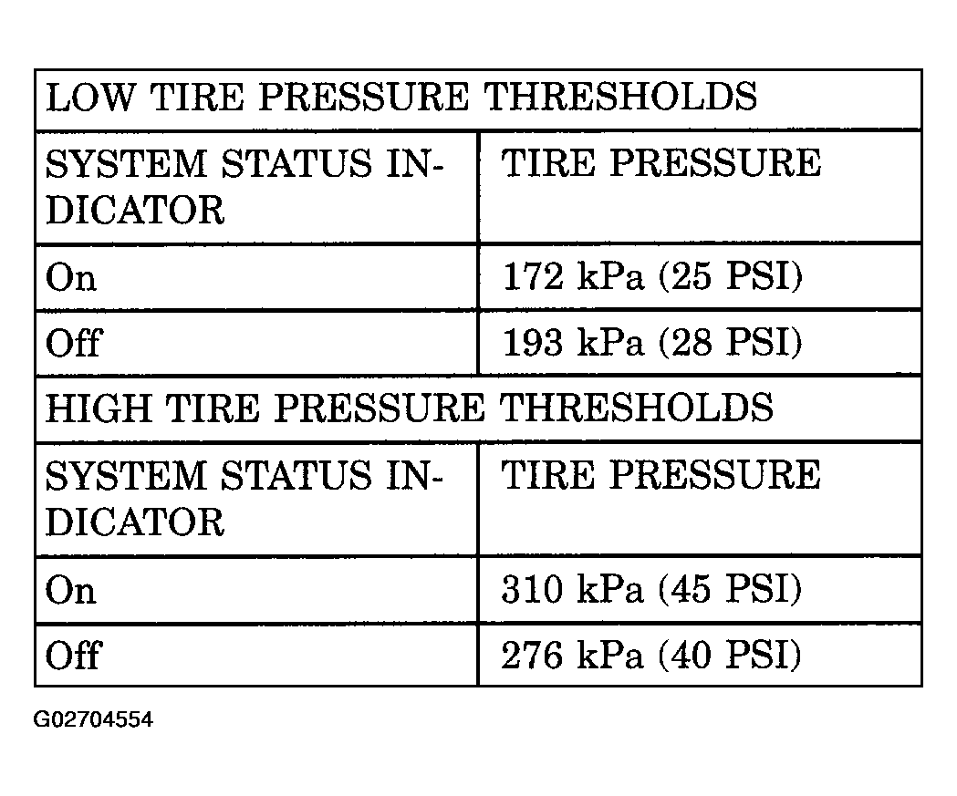 The EVIC will monitor the tire pressure signals from the four (or five) tire sensors and determine if any tire has gone below the low pressure threshold or raised above the high pressure threshold. Refer to Fig 1.