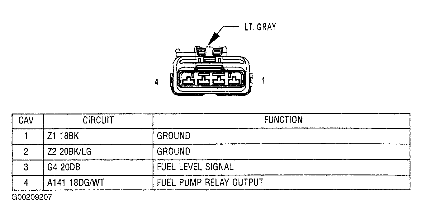 9. Turn the ignition off. Disconnect the fuel pump module harness connector. Check connectors, it is critical that the connector is free from any signs of corrosion or deformities. Clean/repair as necessary. Using a test light connected to battery voltage, probe the (Z1) fuel pump ground circuit at the fuel pump module harness connector. Does the test light illuminate brightly? If yes, go to next step. If no, repair the open/high resistance in the (Z1) fuel pump ground circuit.