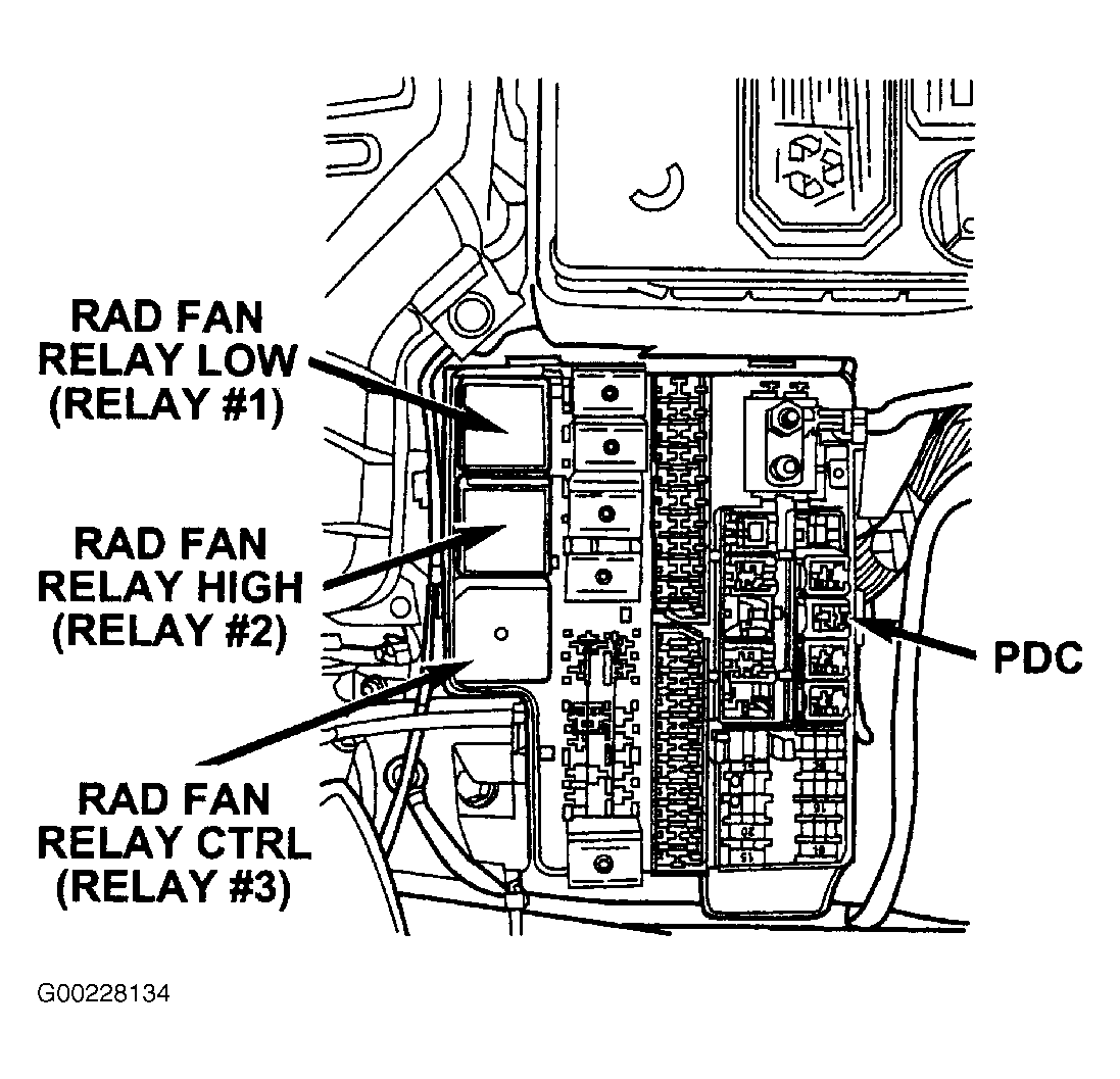 11. Turn the ignition off. Remove the fuel pump relay from the PDC. See Figure or Figure . PDC is located in engine compartment. With a 12-volt test light connected to ground, probe the fuel pump relay fused B+ circuit at the PDC. See Figure or Figure . Does the test light illuminate? If yes, go to next step. If no, repair the fuel pump relay fused B+ circuit. Check for open fuse in the PDC.