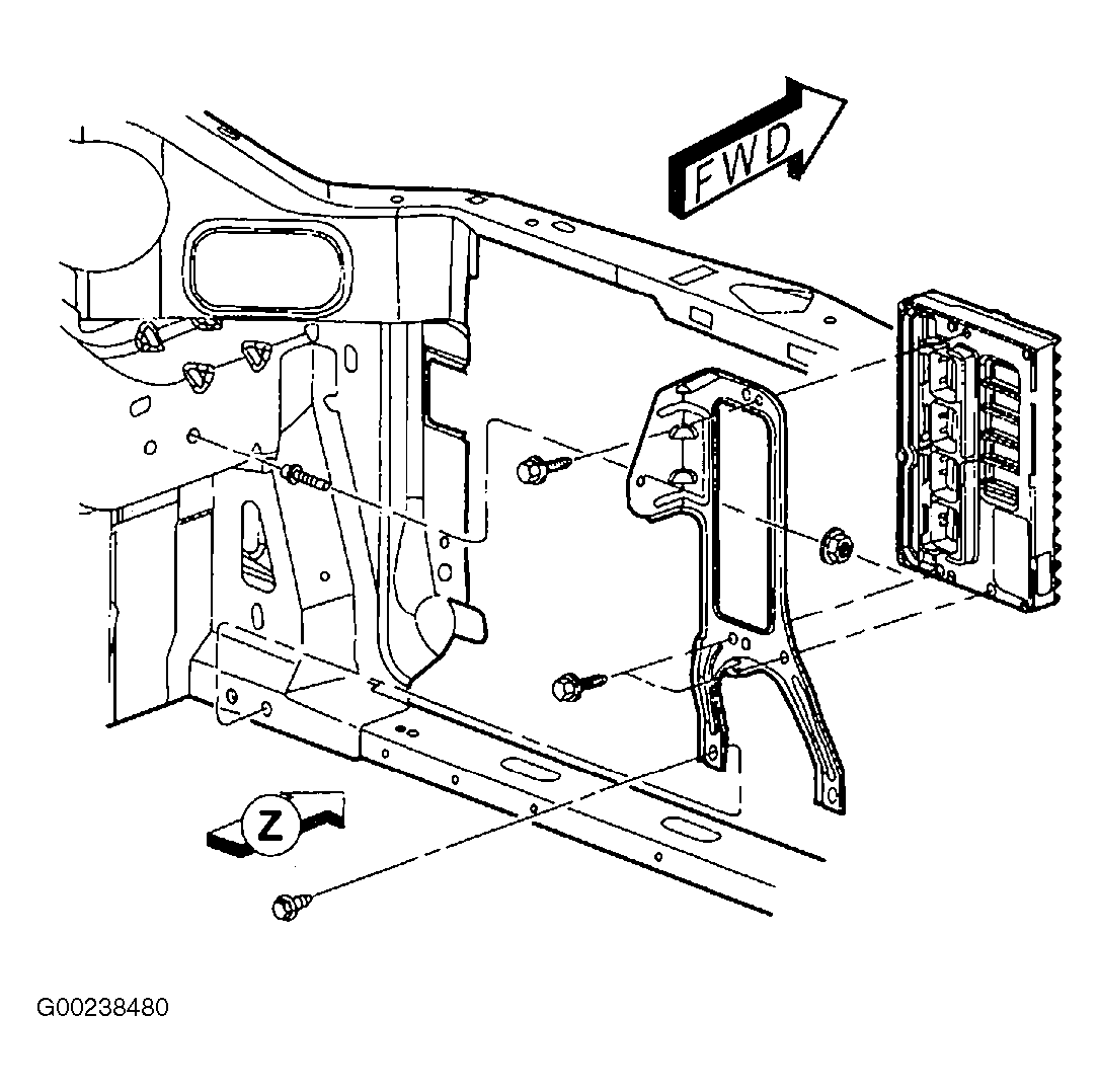 - Remove the mounting bolts from the bottom of the PCM bracket. See Figure.