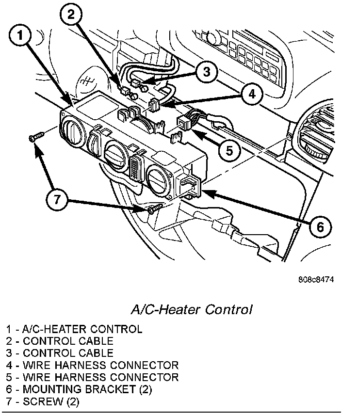 3. Remove the two screws that secure the A/C heater control to the instrument panel.