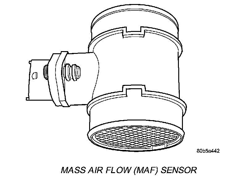 The ECM uses the mass air flow (MAF) sensor to measure air density. The temperature resistor located at the front of the MAF sensor measures the temperature of the inlet air. By varying the voltage, the electronic circuit regulates the temperature of the heating resistor in the rear so that it is 320° F (160° C) higher than the temperature of the intake air. The temperature at the heating resistor is measured by a sensor resistor in-between.