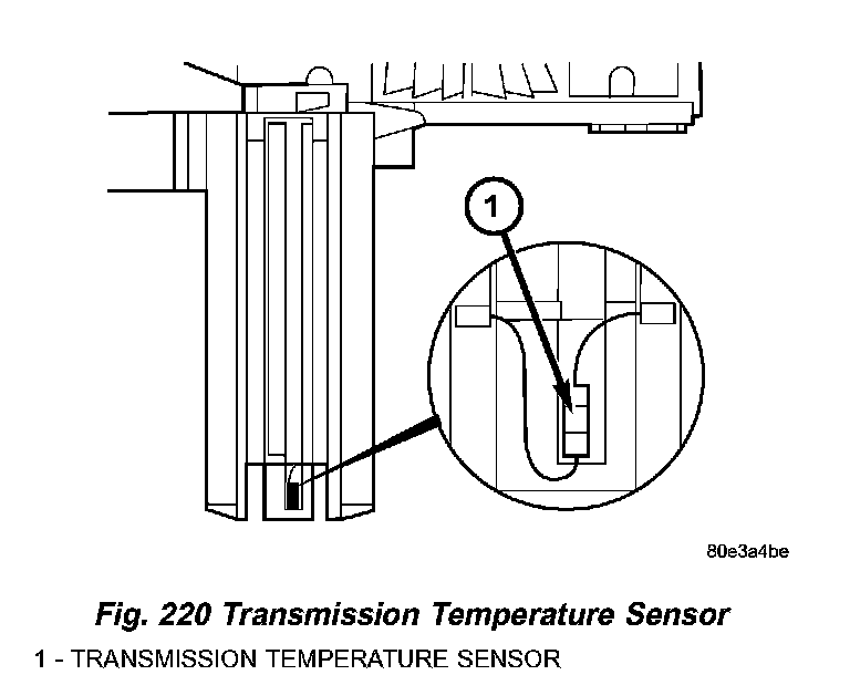Refer to the Transmission Temperature Sensor Specifications table (Fig. 223) for the relationship between transmission temperature, sensor voltage, and sensor resistance.
