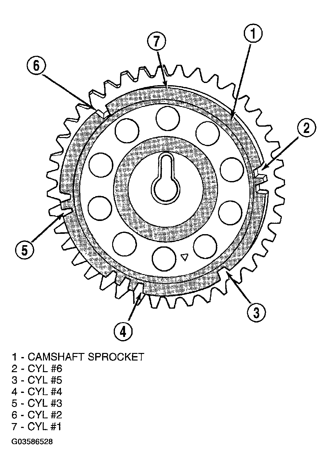 When the PCM receives 2 cam pulses followed by the long flat spot on the camshaft sprocket, it knows that the crankshaft timing marks for cylinder 1 are next (on driveplate). When the PCM receives one camshaft pulse after the long flat spot on the sprocket, cylinder number 2 crankshaft timing marks are next. After 3 camshaft pulses, the PCM knows cylinder 4 crankshaft timing marks follow. One camshaft pulse after the 3 pulses indicates cylinder 5. The 2 camshaft pulses after cylinder 5 signals cylinder 6 (Fig 2). The PCM can synchronize on cylinders 1 or 4.
