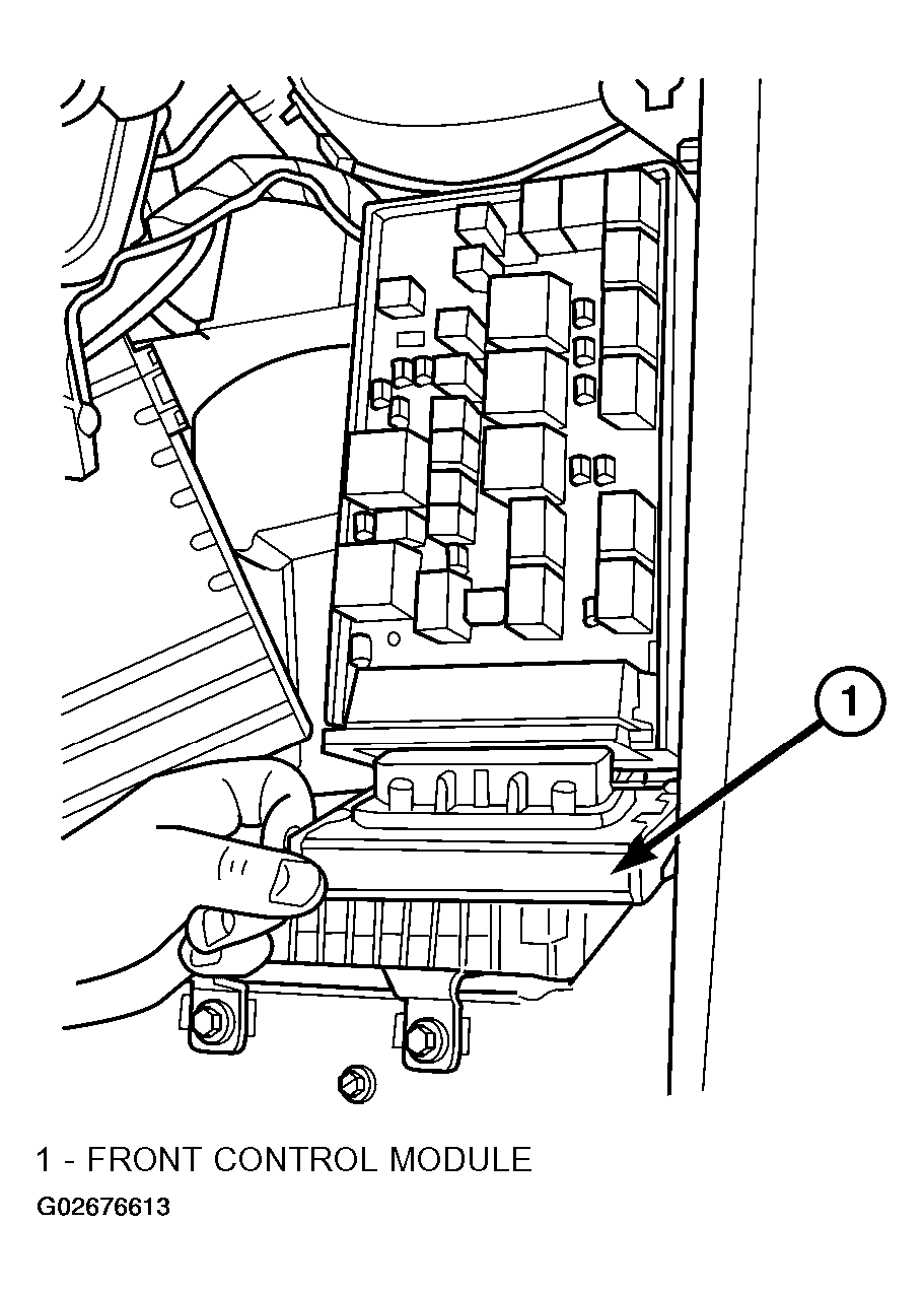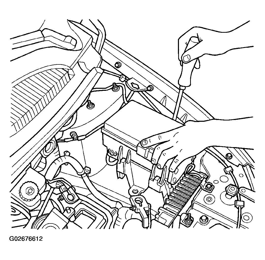 - Using a long flat-bladed screwdriver, gently twist the Integrated Power Module (IPM) retaining clip outboard to free the IPM from its mounting bracket (Fig 1). Rotate IPM upward to access the Front Control Module (FCM) retaining screws.