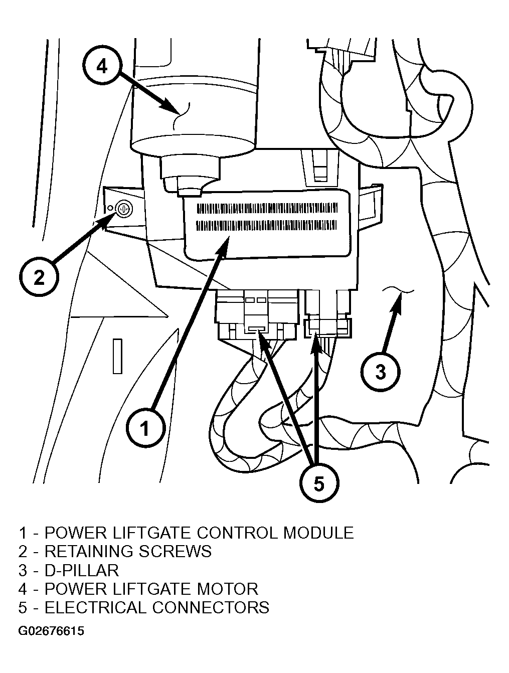 Vehicles equipped with a power liftgate (PLG) utilize a PLG control module. This module is located on the vehicles left side D-pillar just below the motor assembly (Fig 1) and contains a microprocessor, which is used to communicate to the vehicles body control module. The PLG control module receives and monitors logic inputs from all the PLG system switches except for the outside handle switch. This module also contains the software technology to detect lift gate obstructions and stop and/or reverse the door accordingly.