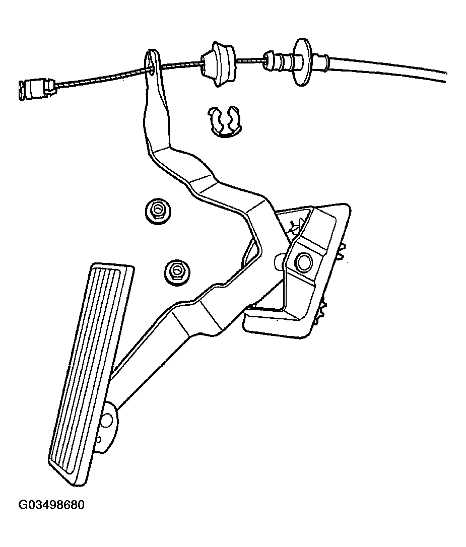 3. From inside the vehicle, hold up the pedal and install throttle cable and cable retainer in the upper end of the pedal shaft (Figure).