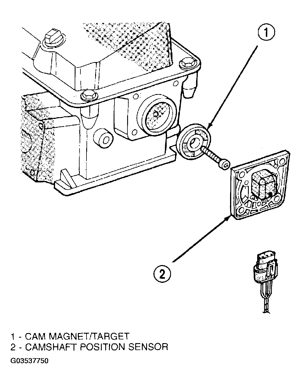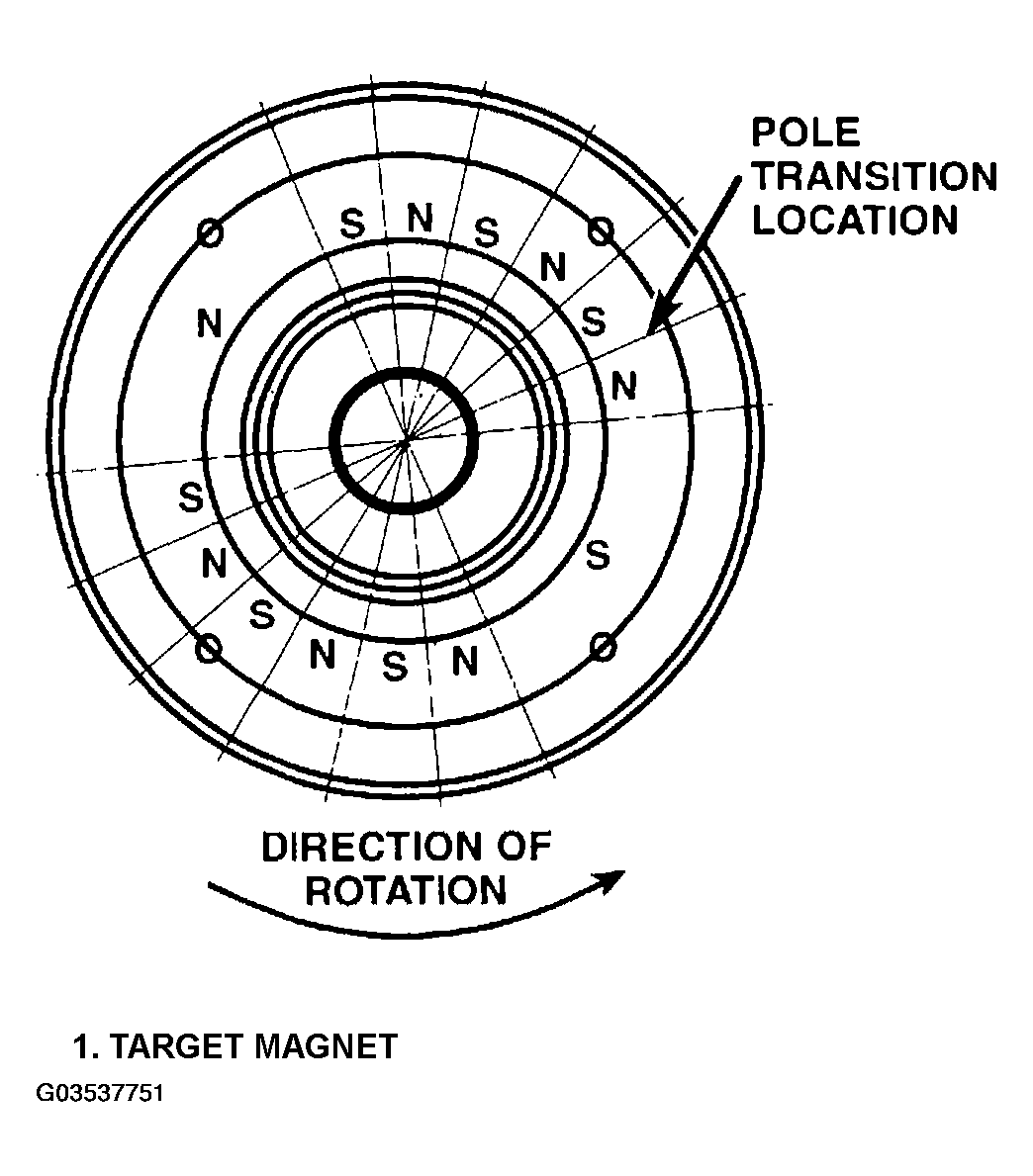 On 2.0/2.4L engines a target magnet attaches to the rear of the camshaft and indexes to the correct position. The target magnet has fourteen different poles arranged in an asymmetrical pattern (Fig 1 ). As the target magnet rotates, the camshaft position sensor senses the change in polarity (Fig 2 ). The sensor output switch switches from high (5.0 volts) to low (0.5 volts) as the target magnet rotates. When the north pole of the target magnet passes under the sensor, the output switches high. The sensor output switches low when the south pole of the target magnet passes underneath.