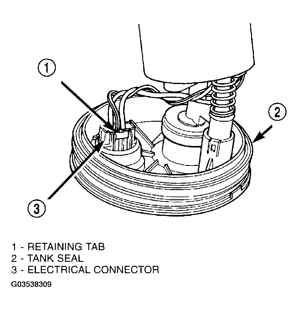 - Depress retaining tab and remove the fuel pump/level sensor connector from the bottom of the fuel pump module electrical connector (Fig 1).