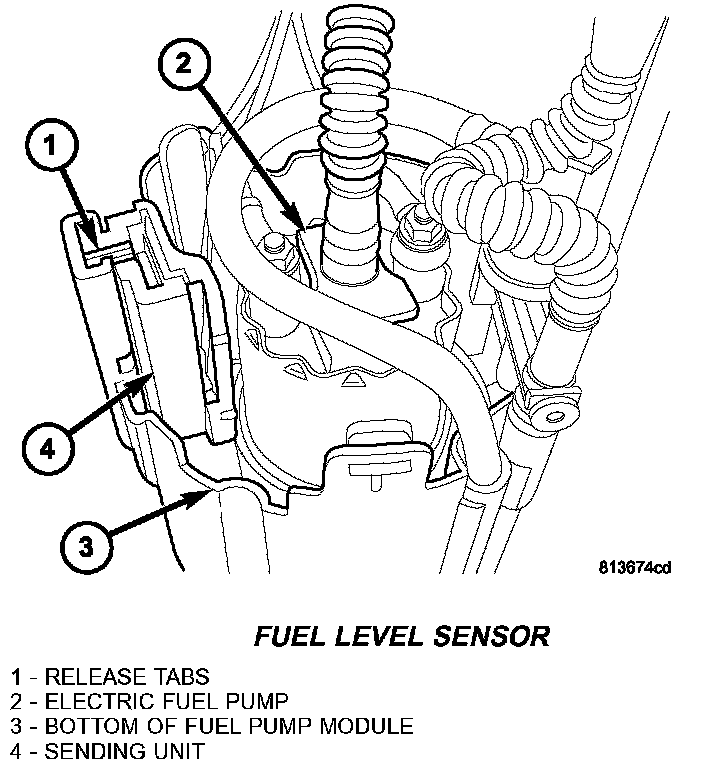 5. To remove sending unit from pump module, press on plastic locking tabs (1) while sliding sending unit (4) on its tracks.