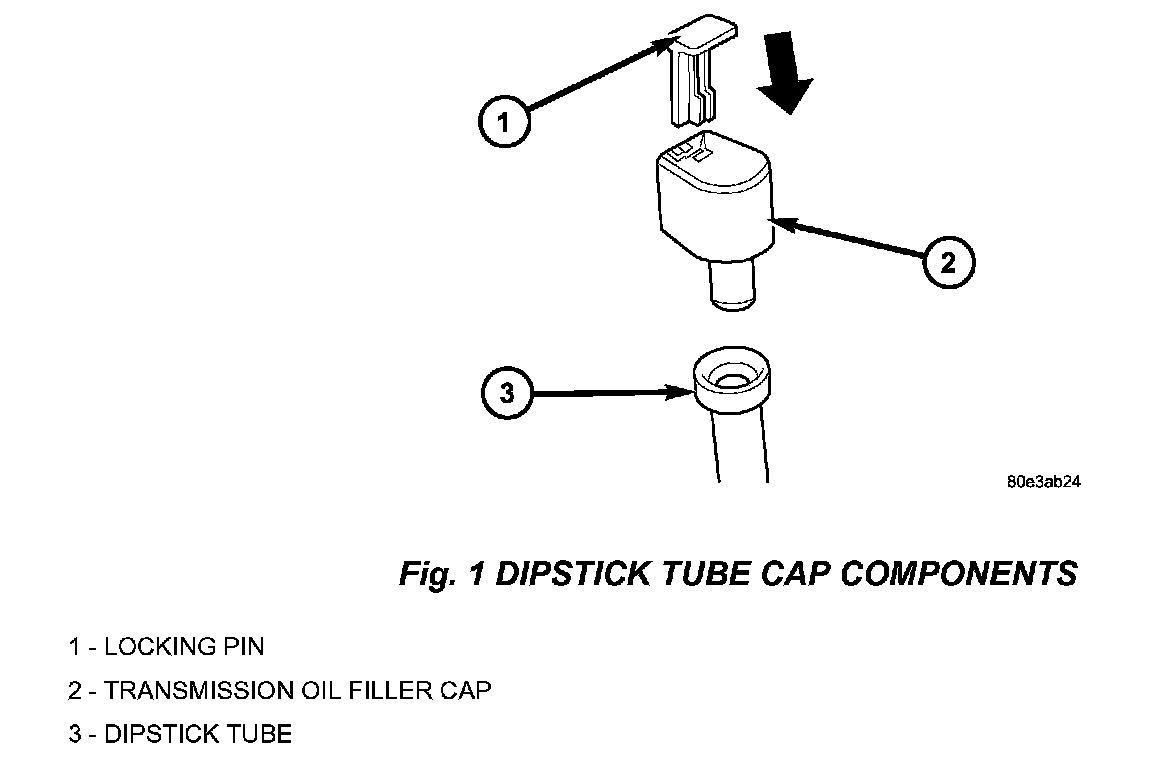 19. When the repair is complete, if the transmission oil fill cap was removed; be sure the 0 ring, p/n 05101154AA, is in place on the transmission oil filler cap and place the cap in the transmission oil fill tube (Fig. 1).