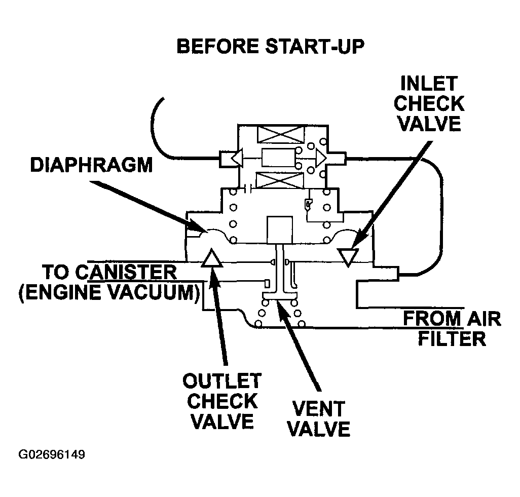 When the LDP is at rest (no electrical/vacuum) the diaphragm is allowed to drop down if the internal (EVAP system) pressure is not greater than the return spring. The LDP solenoid blocks the engine vacuum port and opens the atmospheric pressure port connected through the EVAP system air filter. The vent valve is held open by the diaphragm. This allows the canister to see atmospheric pressure (Fig 1).