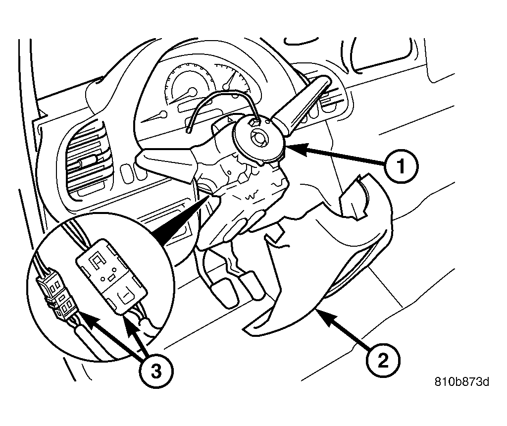 1 - CLOCKSPRING 2 - SHROUD 3 - LOWER PIGTAIL CONNECTOR (2) - Loosen the two screws that secure the clockspring to the multi-function switch housing far enough to engage the clearance holes in the clockspring rotor and to disengage the clockspring case from the switch housing.