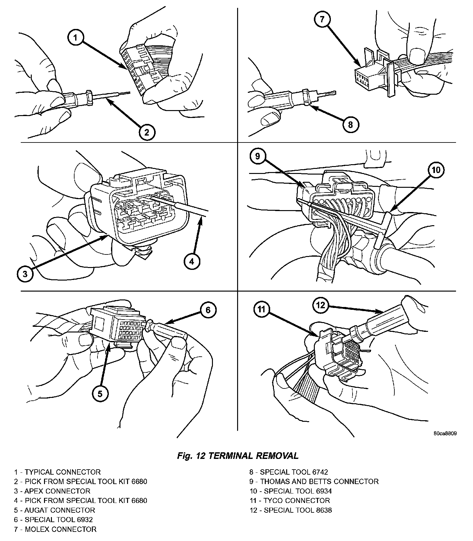 6. Position the connector locking finger away from the terminal using the proper special tool. Pull on the wire to remove the terminal from the connector (Fig. 12).