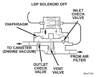 Based on reed switch input, the PCM de-energizes the LDP solenoid, causing it to block the vacuum port, and open the atmospheric port. This connects the upper pump cavity to atmosphere through the EVAP air filter. The spring is now able to push the diaphragm down. The downward movement of the diaphragm closes the inlet check valve and opens the outlet check valve pumping air into the evaporative system. The LDP reed switch turns from open to closed, allowing the PCM to monitor LDP pumping (diaphragm up/down) activity (Fig 1). During the pumping mode, the diaphragm will not move down far enough to open the vent valve.