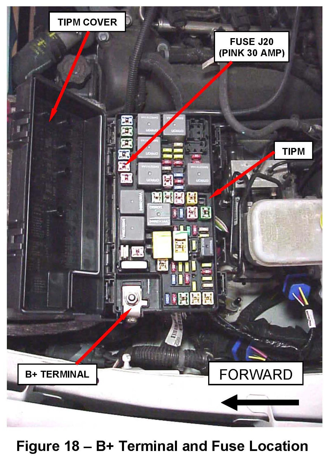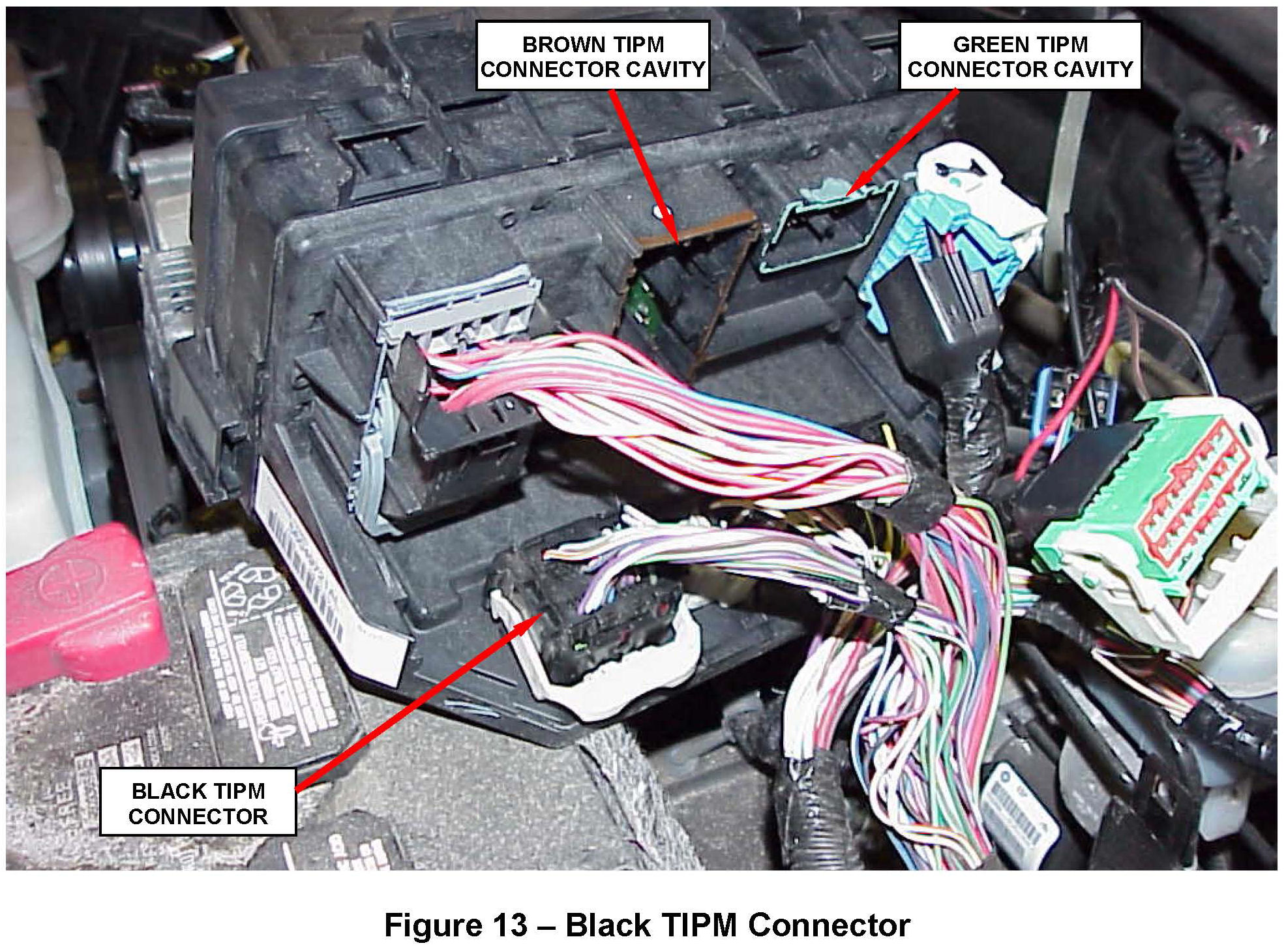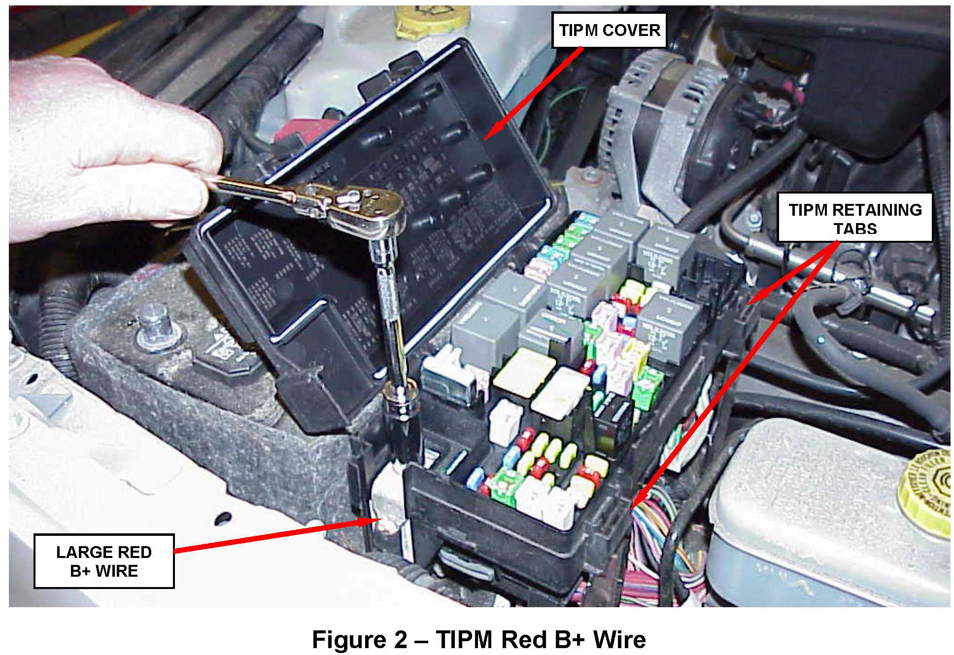2. Open the Totally Integrated Power Module (TIPM) cover and disconnect the large red B+ wire from the TIPM (Figure 2).