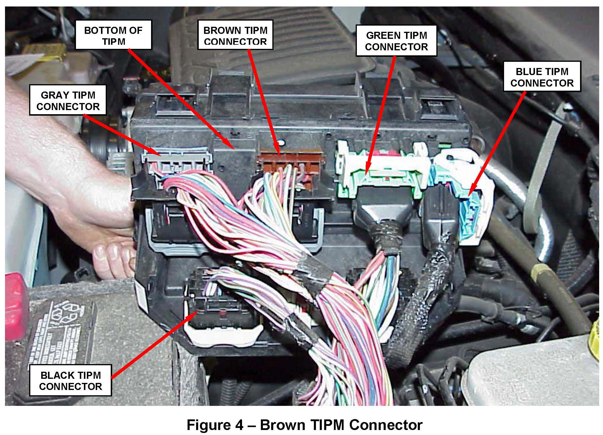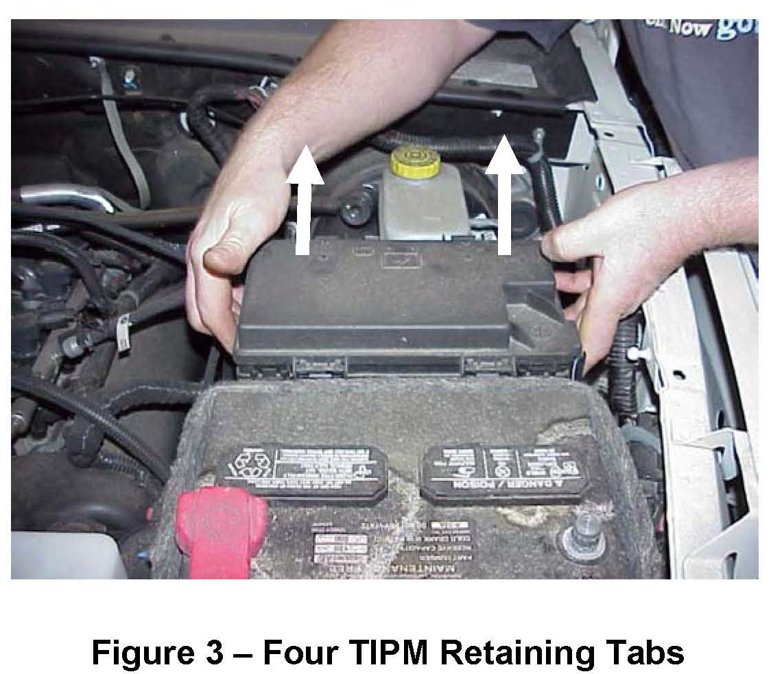 3. Disconnect the TIPM assembly from its mounting bracket by compressing the four retaining tabs and pulling straight upward. This will allow access to the wiring connectors located on the bottom side of the TIPM (Figure 2 and 3)