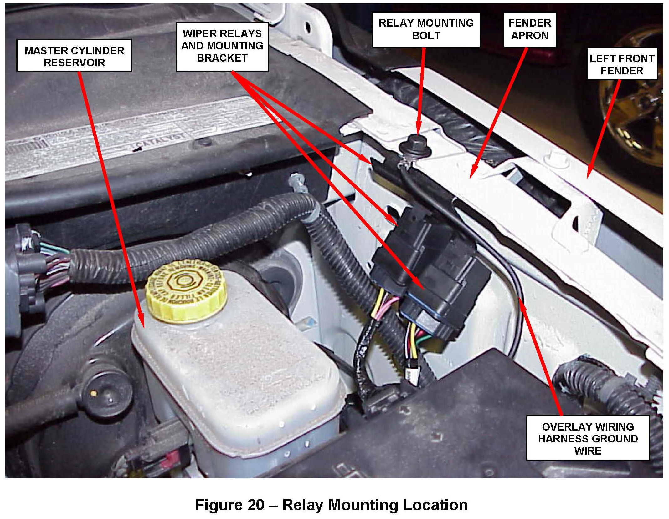 14. Install the relay bracket and ground wire from the overlay wiring harness using the supplied bolt into the existing hole on the left fender apron (Figure 20). Tighten the bolt to 195 in. lbs. (22 N.m).