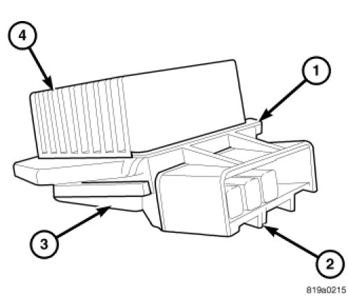 The blower motor power module is mounted to the bottom of the HVAC housing, on the passenger side of the vehicle. The blower motor power module consists of a molded plastic mounting plate (1) with an integral connector receptacle (2). Concealed behind the mounting plate is the power module electronic circuitry (3) and a finned aluminum heat sink (4). The blower motor power module is accessed for service from under the instrument panel.