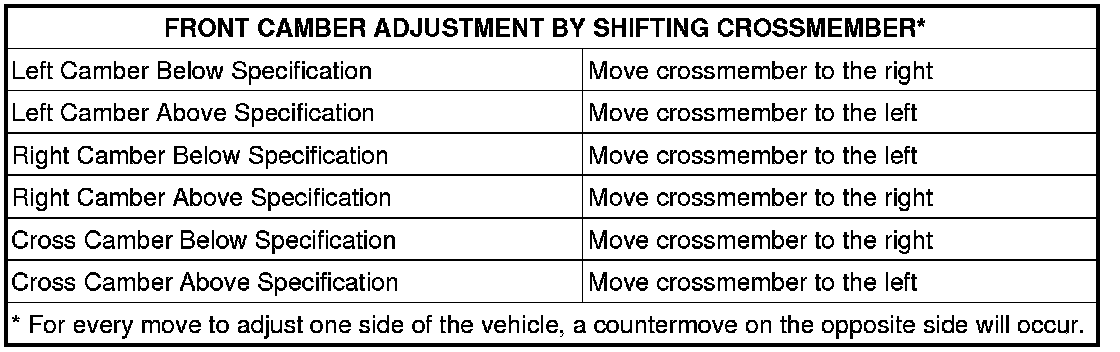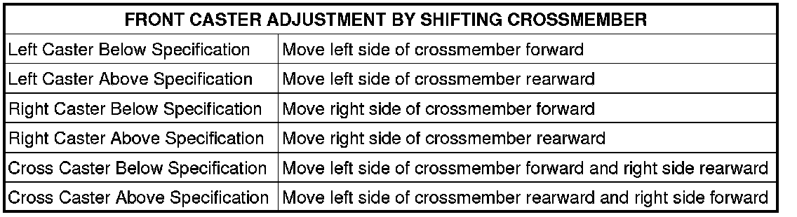 3. Shift front crossmember as necessary (See following tables) to bring camber or caster into specifications. When shifting crossmember, use care not to move other angles (camber or caster) that are within specifications, out of specifications.