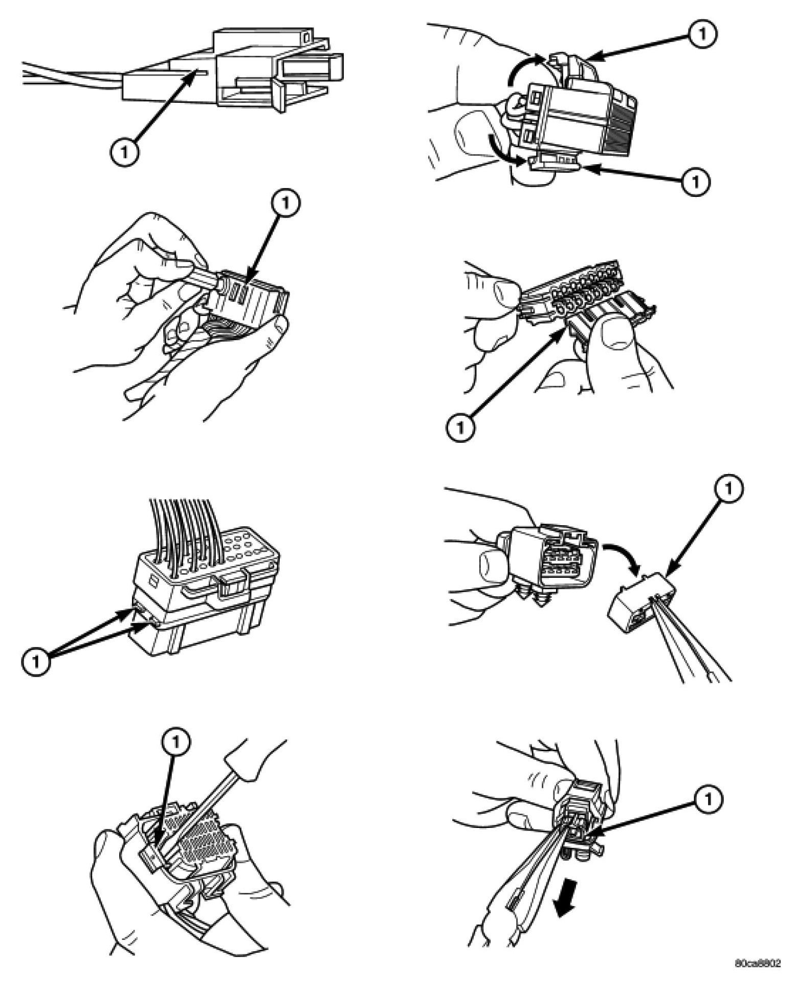 6. Position the connector locking finger away from the terminal using the proper special tool. Pull on the wire to remove the terminal from the connector.