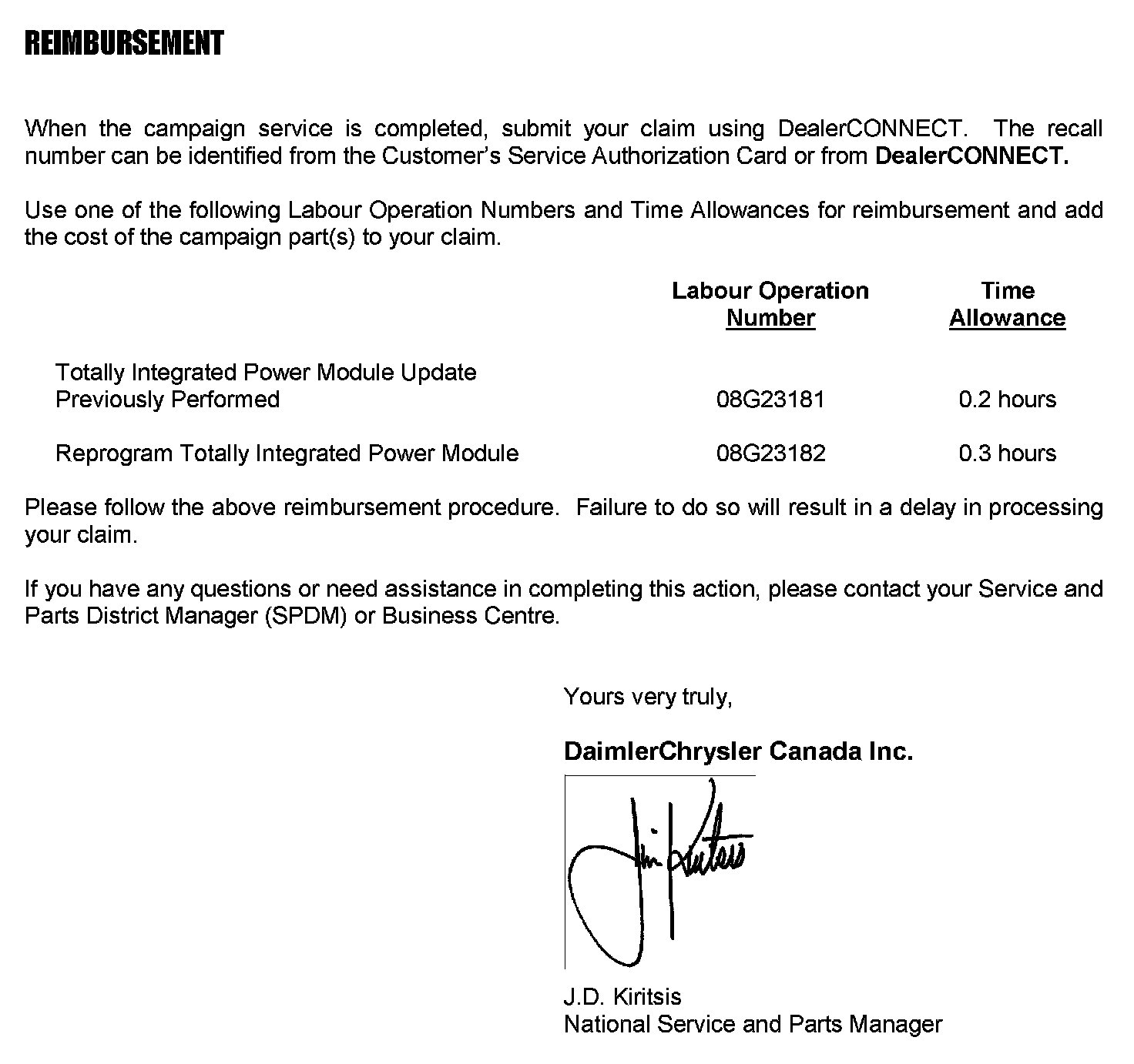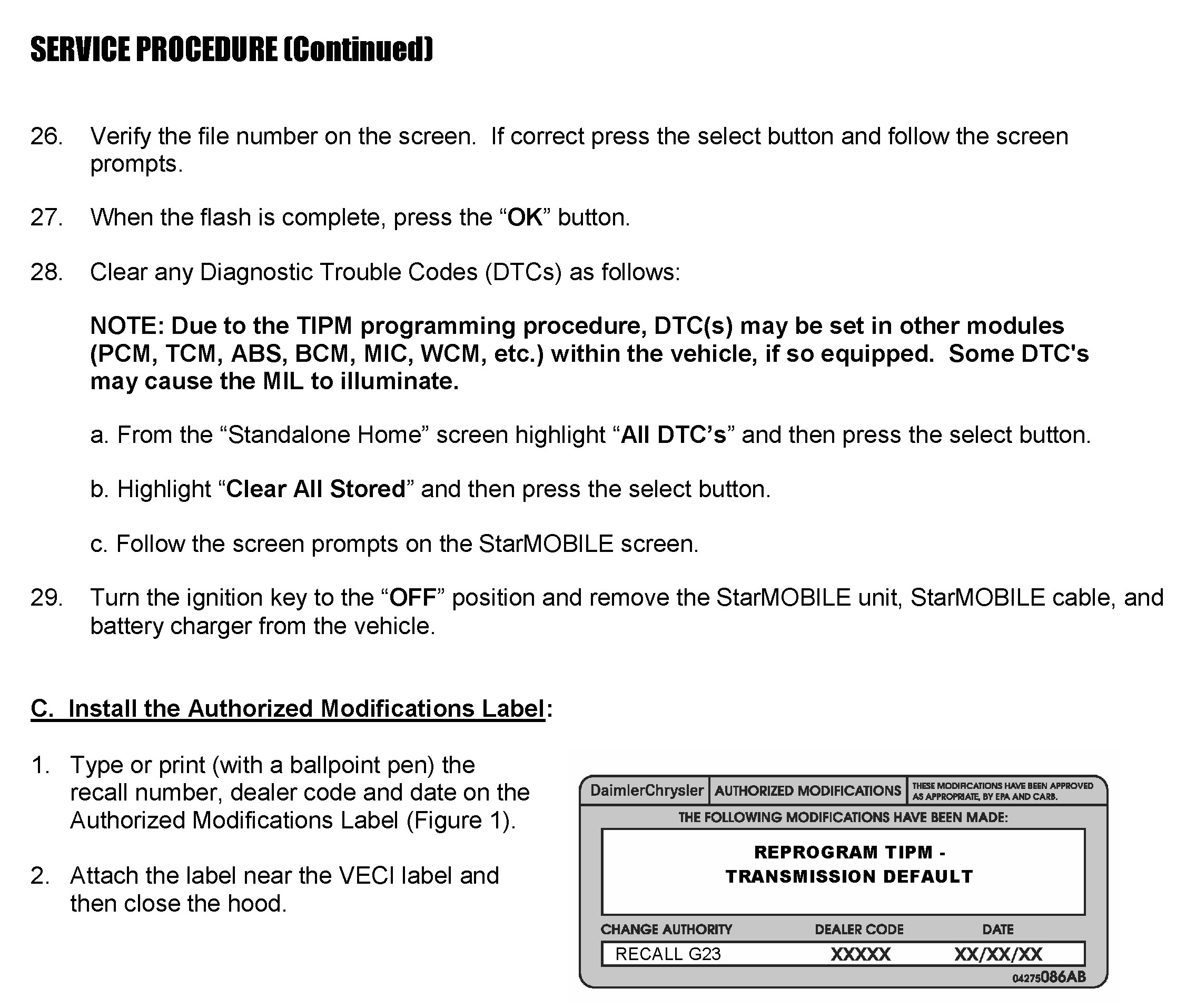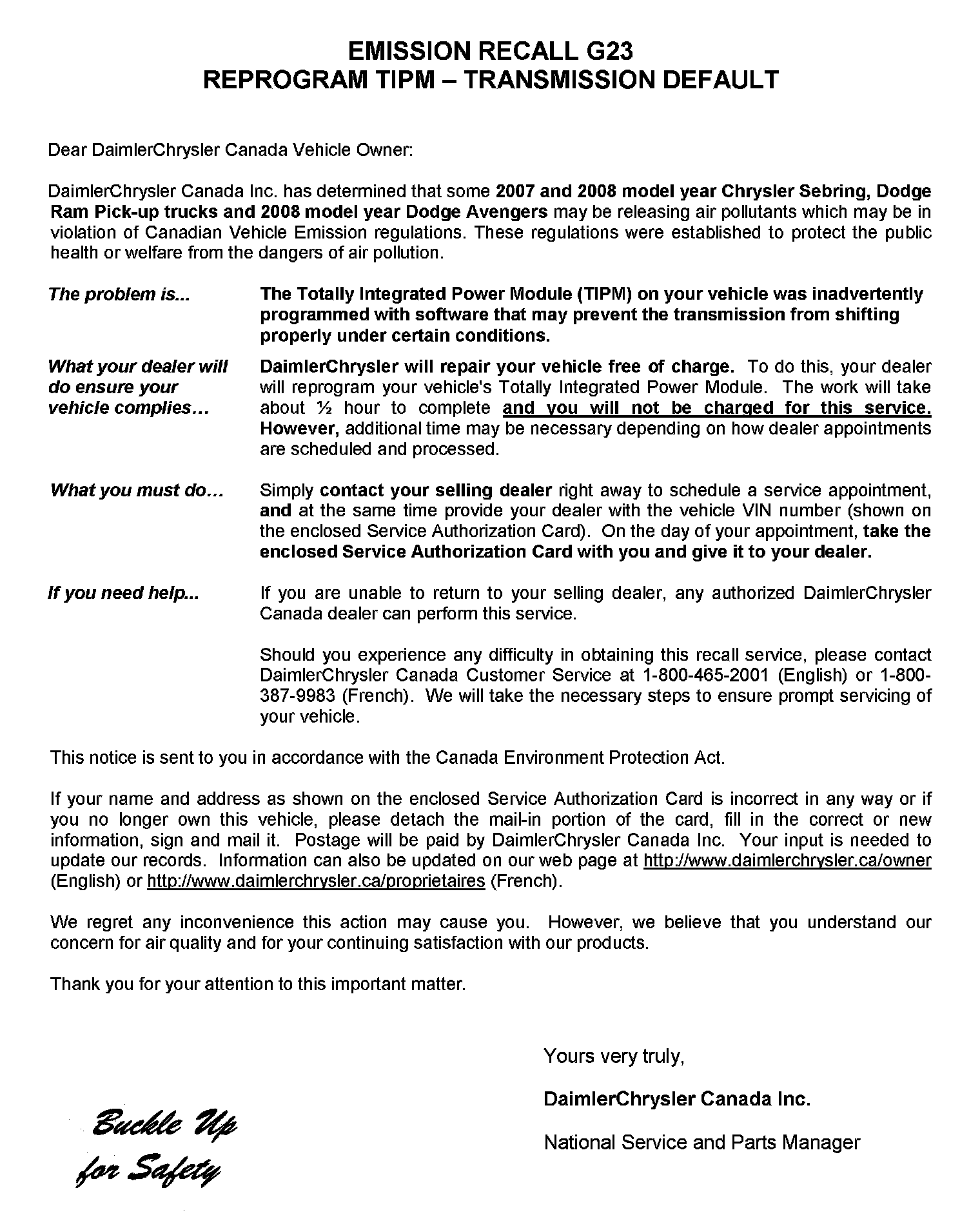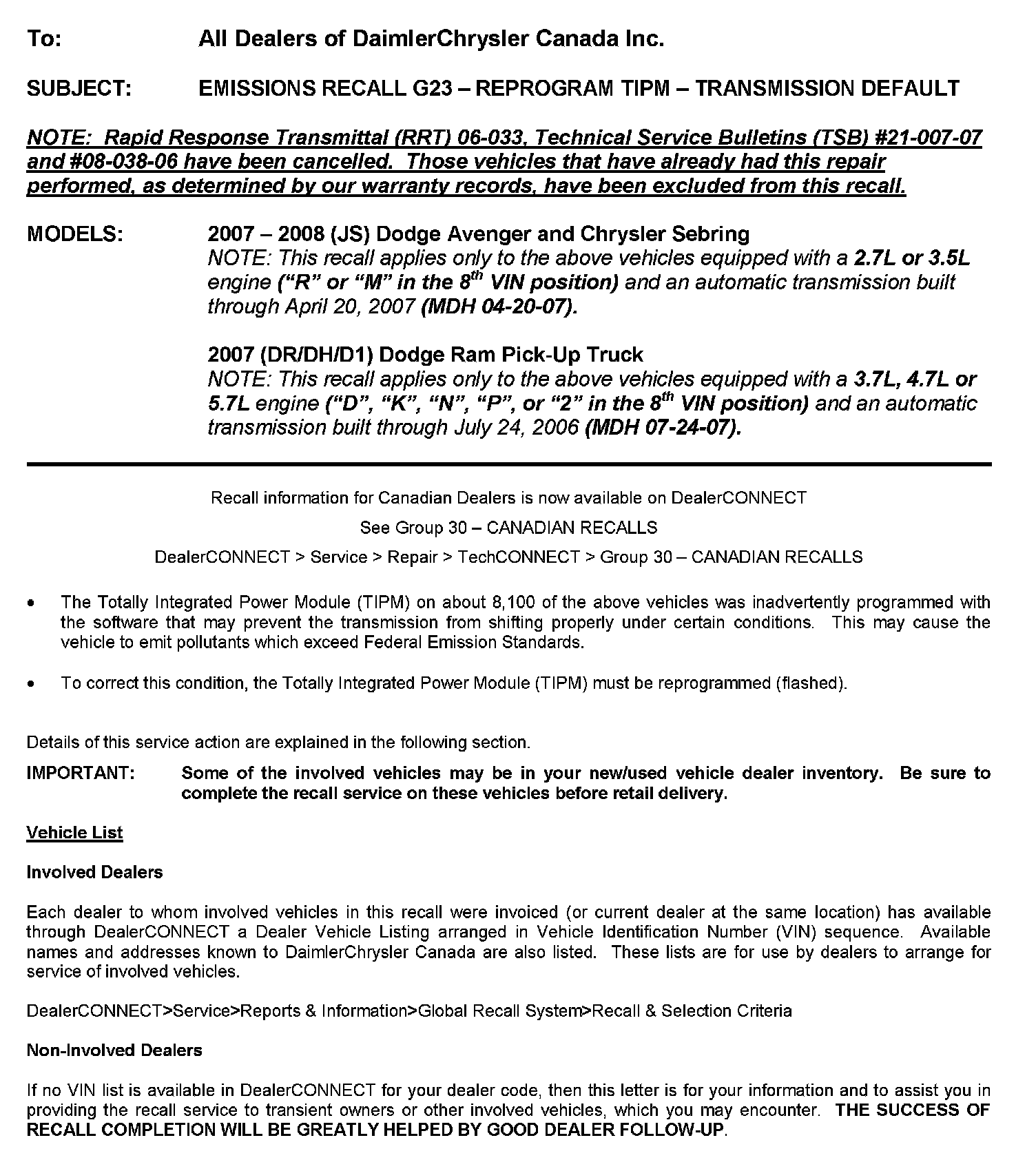 Home >> Dodge and Ram >> 2008 >> Avenger V6-2.7L >> Repair and Diagnosis >> Powertrain Management >> Transmission Control Systems >> Relays and Modules - Transmission and Drivetrain >> Relays and Modules - A/T >> Control Module >> Technical Service Bulletins >> Recalls >> Canada - Recall - G23 Reprogram TIPM A/T Default