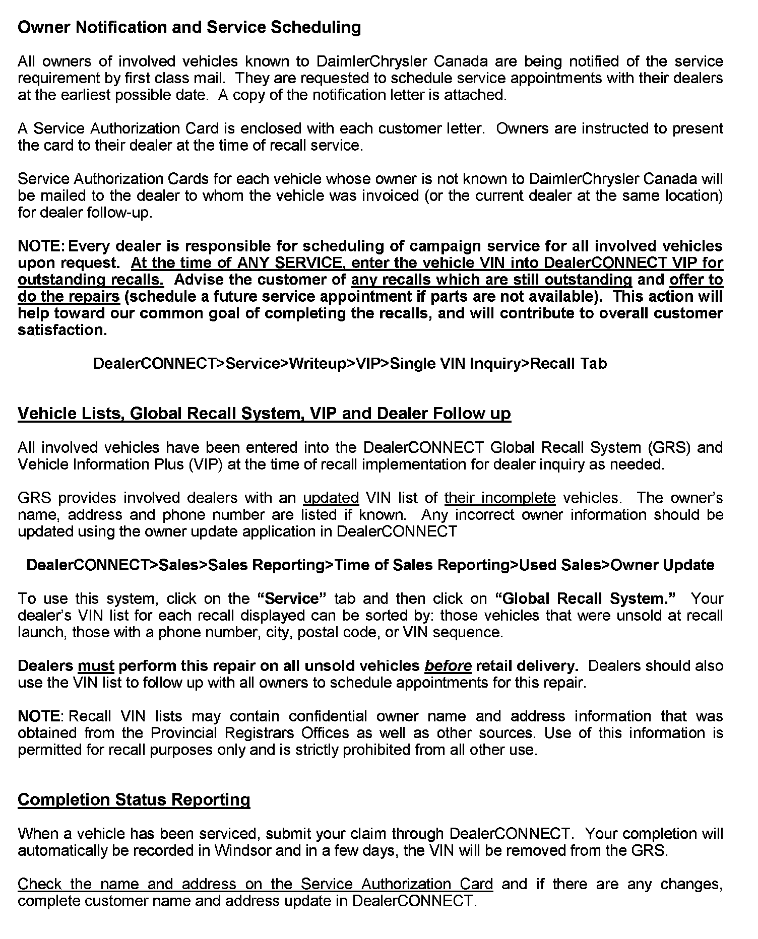 GRS has been developed to provide dealers with an up-to-date list of involved vehicles by recall number and by dealer code. Owners known to DaimlerChrysler are also listed. Involved vehicles will be removed from the GRS within several days of submitting repair claims.