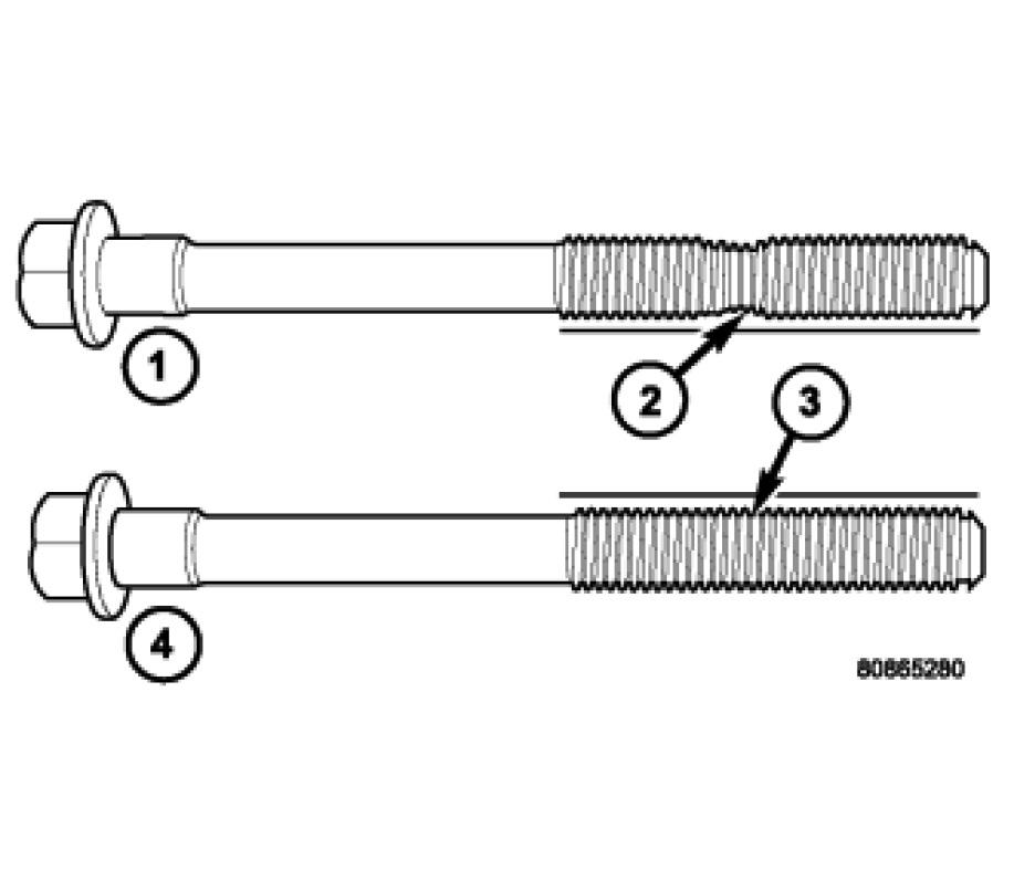NOTE: The cylinder head bolts (4) are tightened using a torque plus angle procedure. The bolts must be examined BEFORE reuse. If the threads are necked down the bolts must be replaced