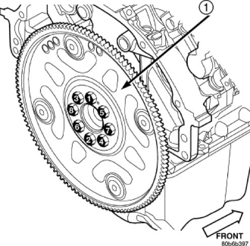 2. Tighten the flexplate retaining bolts to 95 Nm (70 ft. lbs.) in the sequence shown.