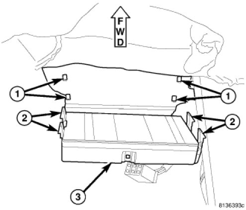 2. Position the retaining clips (2) with the retaining holes (1) in the floor cross member. Firmly apply even pressure to the module (3) until all four retaining clips (2) snap into place.