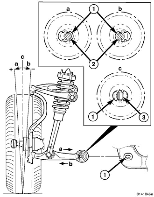 - To achieve more positive caster, refer to (a) in the figure. Move the lower control arm in the desired direction, then insert the adjustment bolt (2) with a washer installed through the bat wing hole in the engine cradle (1) and the round hole in the bushing inner metal.