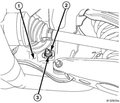 7. Loosen the cam bolt nut securing the toe link to the rear crossmember (front of rear crossmember) just enough to rotate the cam bolt (1).