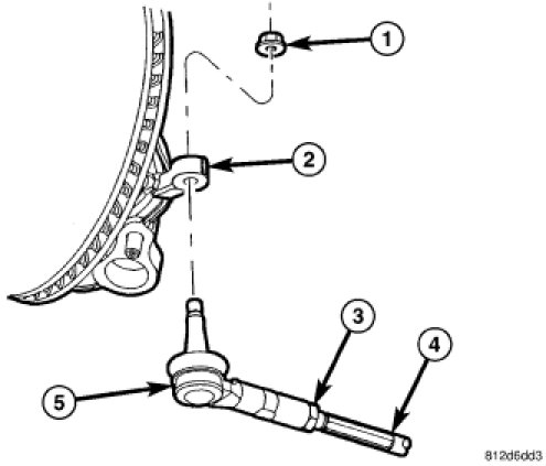13. RWD - Loosen the jam nut (3) at the inner-to-outer tie rod (4-5) connection.