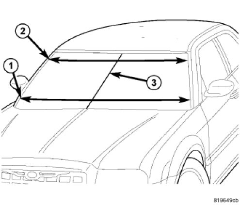 12. Take a measurement (2) across the lower edge of the tint band at the top of the windshield on each side of the glass as the reference points.