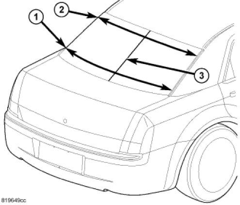 17. Take a measurement across the upper edge (2) of the rear glass using the vertical edges of the body opening as the reference points.